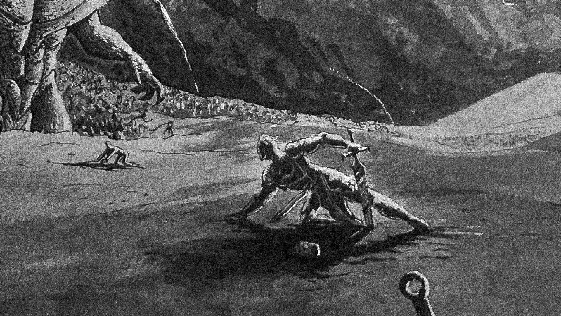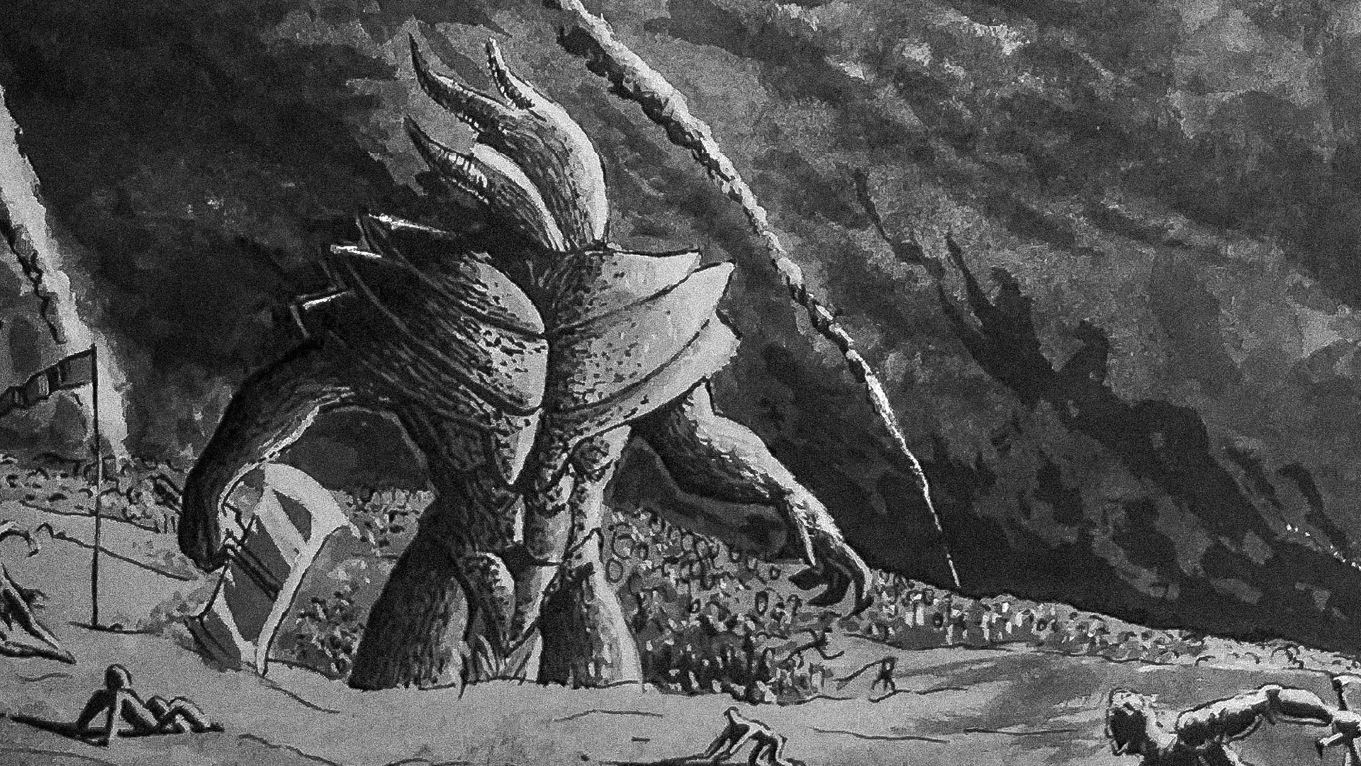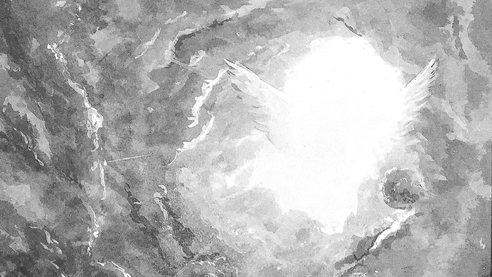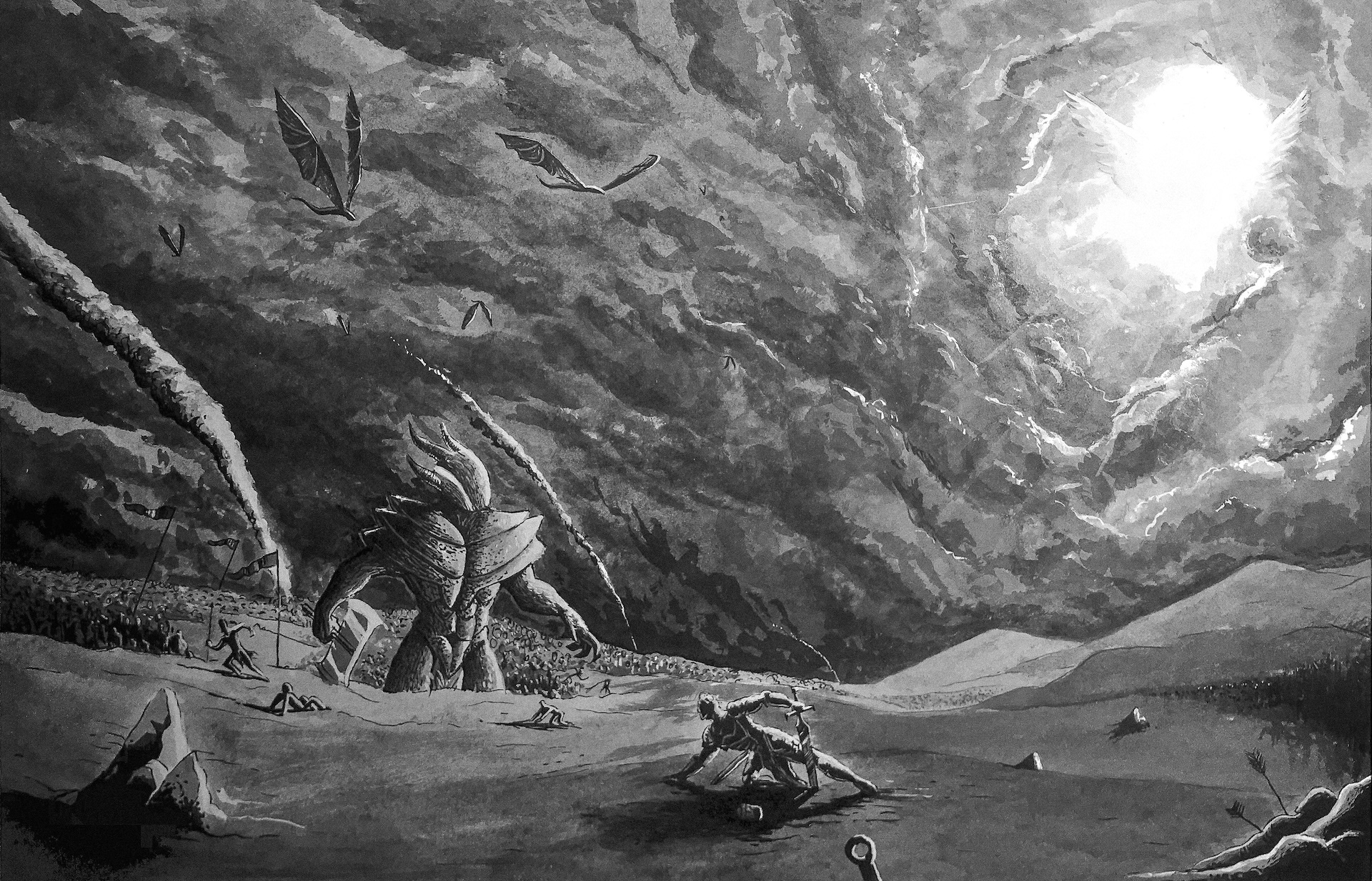 Ink, watercolor and gouache illustration of a epic and fantastical battle at the end of the world, with some sort of light appearing at the very moment all seemed lost.